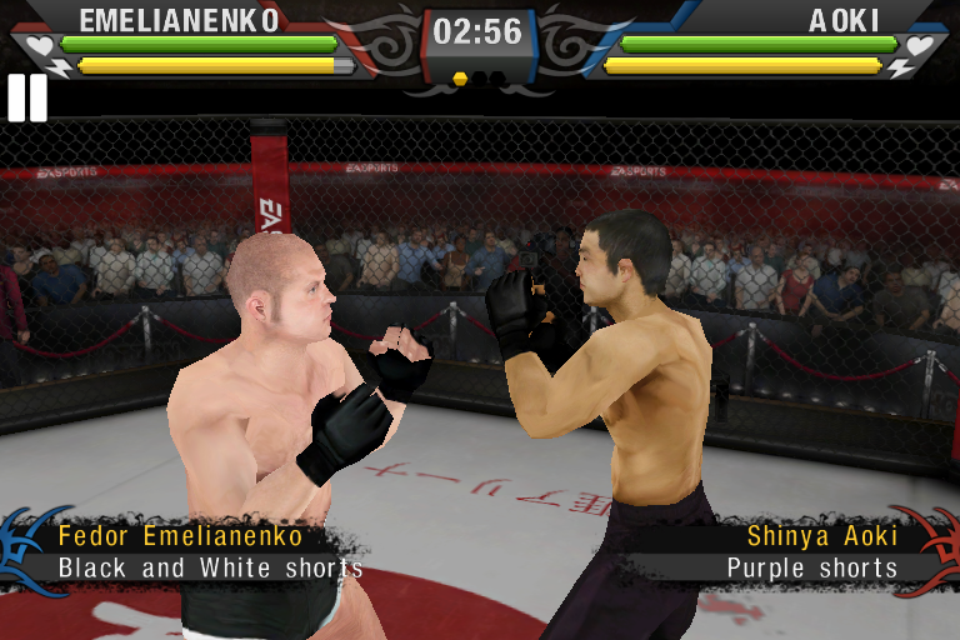 The overall presentation is very crisp. There is console-quality voice commentary during each fight and right from the start-up screen a nice and short intro movie shows Fedor knocking another fight out cold. Before beginning to fight the game shows a tutorial where a fighter trained me and showed me every facet of the game’s controls — from standup strikes to grappling and ground fighting. Before the fight ring girls also make an appearance in great form as does Big John McCarthy. The title has a wide range of sound effects and music — during the fights screams and cheers occur in the background depending on what is happening in the ring and various songs or beats play when pausing the game or going in the options menu.