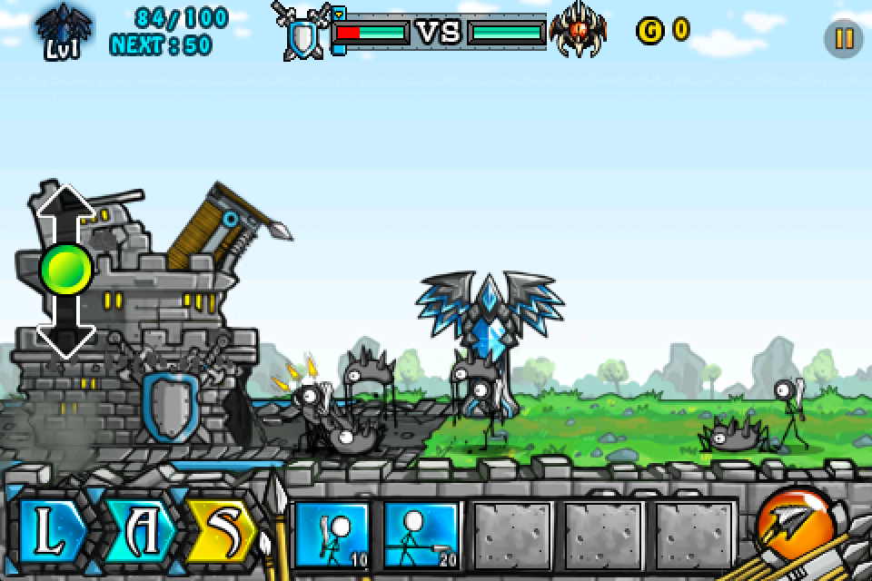 The game is divided into two main parts — the hero mode, and the castle defense-RTS mode. Heroes are controlled in real time in gun-action mini-missions against a large number of enemies or enemy ‘special forces’ that is similar to the previous Gunner title. The heroes can gain levels with experience points and be upgraded as well. On the other hand the game has a very deep castle defense game with lots of units to choose — new to the series are air units — and ther eis a large bow to control and launch arrows at enemies. This is done by tilting the angle of the bow with an arrow to fire at different parts of the battlefield. Be careful not to tilt the bow too low and hit the wrong army however. Mana is used as a resource for creating units or using special abilities to rain down on enemies for example. The mana fills up to a certain extent before it has to be used up by the player or it can be upgraded to gain levels and charge to higher amounts and recharge faster. This is done by using some of it up as cost for the upgrade.