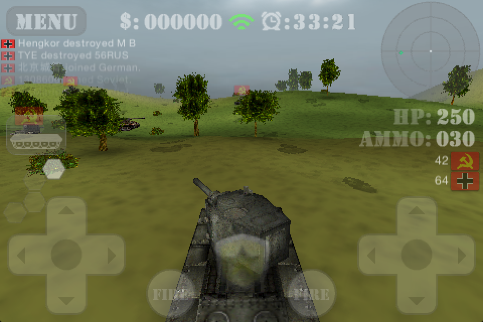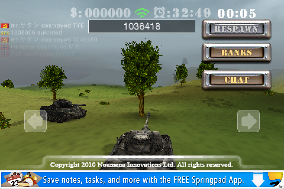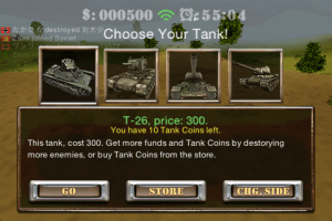 There are two dpad icons near the bottom of the screen that are used for control of your tank. The left icon changes the speed or ability to move backwards and the right icon changes the turret positioning by allowing you to rate it left and right as well as raising and lowering it for aim. The tanks all control in a variety of ways ranging from quick but easy to destroy to the heavy hitters that aren’t as mobile but can fire further away along with their armor advantage. Each class of tank requires its own strategy and mastery of control. In general however, the cheaper the tank the harder it is to be effective against the enemy. There is also a waiting period, that depends on the tank you choose, between reloading and firing succeeding shots. It’s possible to also see ranks and even chat in the game’s menu when waiting for your tank to re-spawn.
