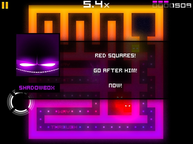 You are a pink square block trying to find a way to escape the game-world environment constraining him and avoid red enemy-squares in the process. In the first few tutorial levels a yellow and immobile block named Cratos teches the mechanics of the game. He can also be moved around in mid level. A purple arch-rival named Shadowbox will also make an appearance from time to time during levels to tell you how pointless trying to escape is and how he really is in control.