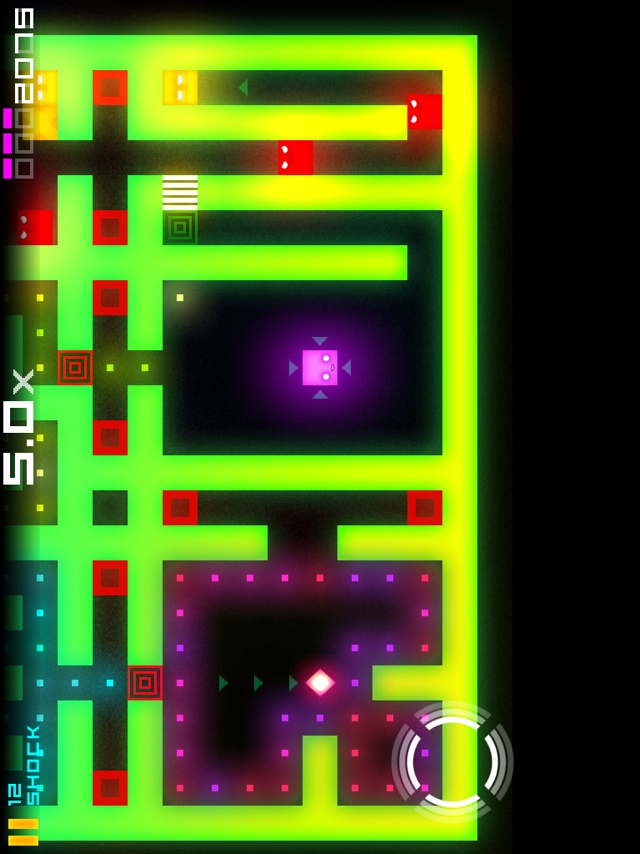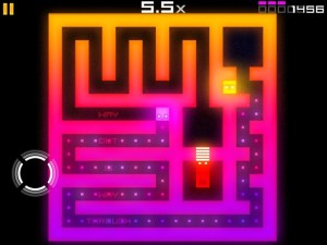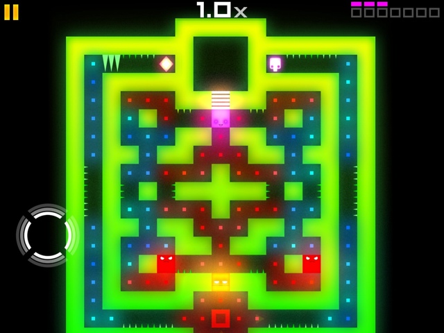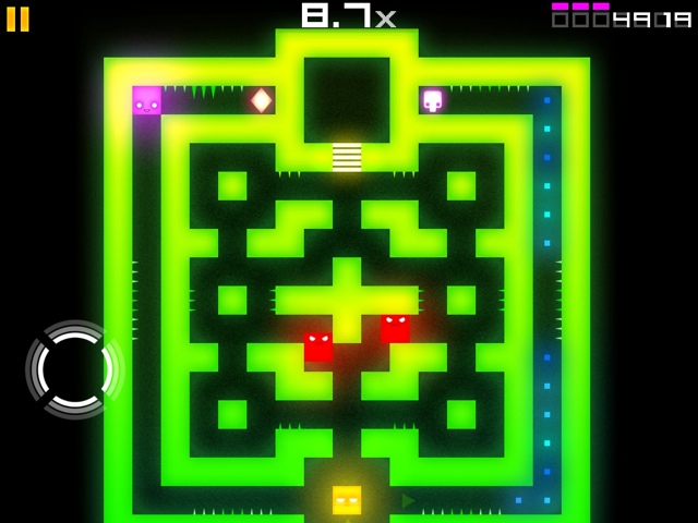 The pink square in your disposal is controlled by a virtual dpad that never really gets in the way of the action and is implemented pretty well. At times moving perfectly in a specific direction may cause problems, but only in wide open spaces. You can move Cratos as well as certain yellow blocks to manuever through each level and find exit points after collecting all the dots. Other blocks are immobile, however, and you have three chances or lives to avoid the red enemy-blocks. As you keep gathering point multipliers are awarded as long as the pink square doesn’t get hit. There are also various platforms that need to be activated in order to open an entry point or door to a new section of the level and this is done by doing puzzles such as moving a block onto a switch.
