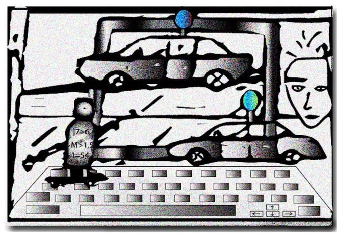 The idea behind it is that one of the vehicles comes out of the display similar to AR or augmented reality while a keyboard sits in front. I then realized that the display is not really connected, but changed this a bit in my colored or last variant (look for the last version below).