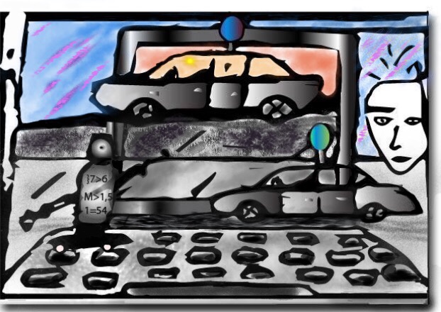 I have recently published an article on Forbes related to autonomous vehicles, which you can read here. I started thinking about how I would add artwork to the piece as I was publishing it and I started to remember how one time I got inspired to turn a hand-drawn artwork into a digital design. Thus, I tried my hand at experimenting by hand and ended up using charcoal this time in order to draw an interpretation of driverless and computer-powered vehicles. I also added a computer screen of sorts and a robot on a skateboard-like propeller.