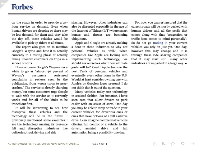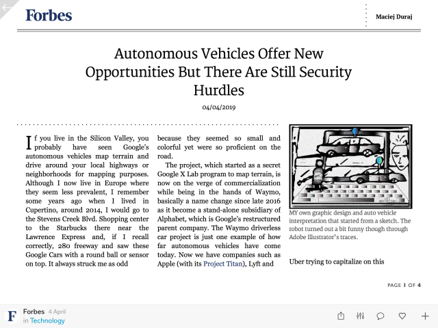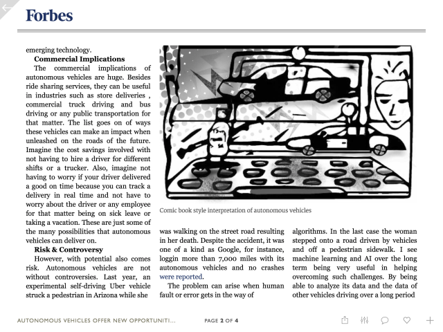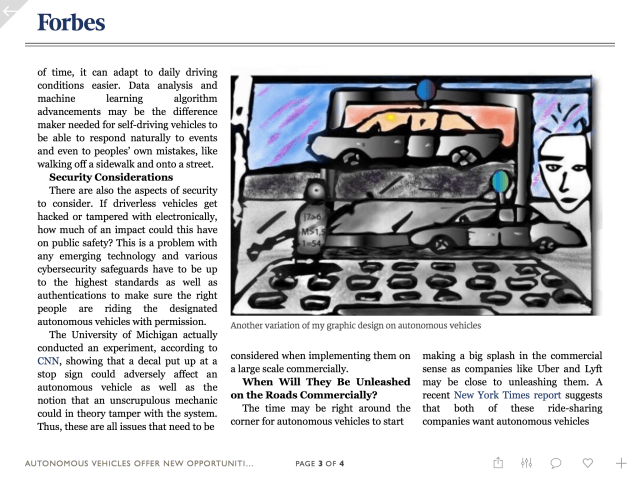 I used a filter or effect to get it to look like that and the shadow obviously turned out better. However, I do like the abstract nature of the way the images turned out without the use of Illustrator as well (Procreate and Artstudio). There is both goodand bad or stylistic differences in both approaches. The article is available here again and focuses on driverless technologies or autonomous vehicles: