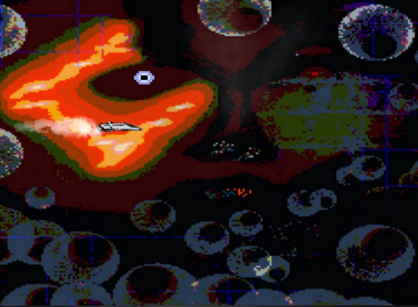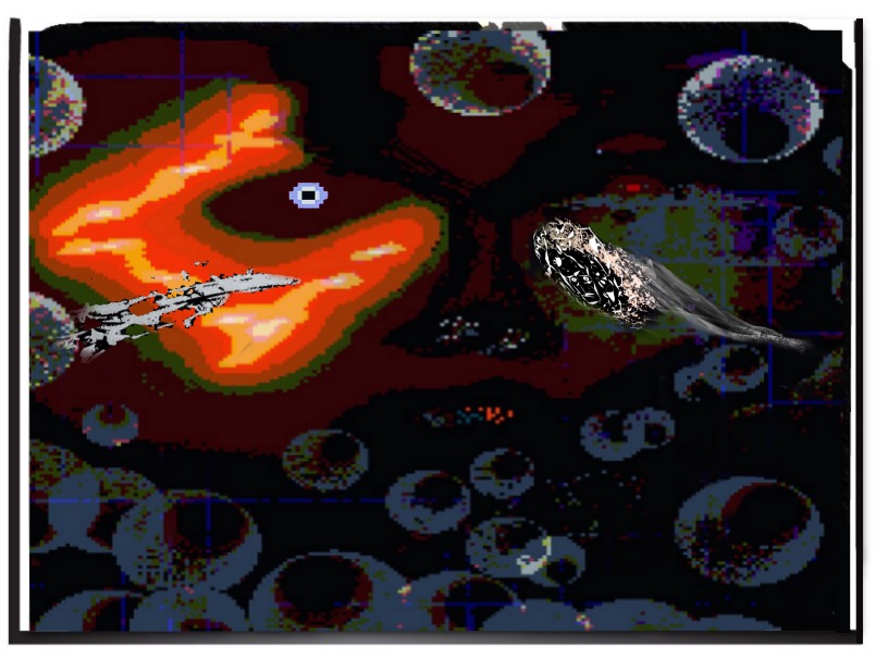What I did was I added some older assets I had prviously created and had in my disposal. These assets include a space ship and a head-like boss or enemy type of object that the ships is facing. However, I decided not to piselize these assets or objects and just leave the background pixelated.
