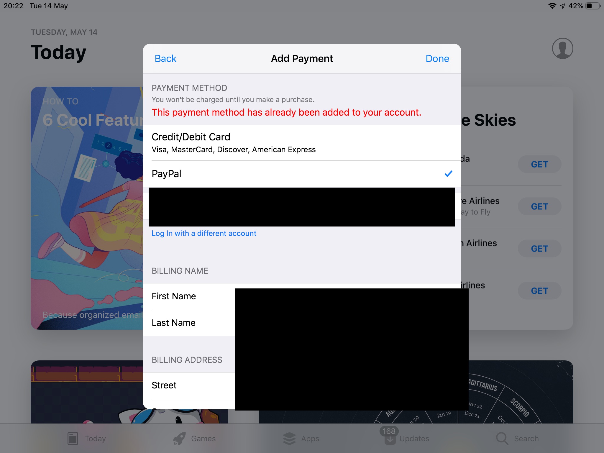However, Apple has no option from me to sign in from this screen. When I sign in separately on a browser, nothing changes. When I press done, nothing happens. Keep in mind that this is a separate screen form me going to settings. This screen appears when I try to make a purchase. However, even when separately going into my settings screen and trying to enter this information, remove my paypal account or switch regions, the same issue arises. I can only update apps, but not make any new purchases or new downloads of even free apps.