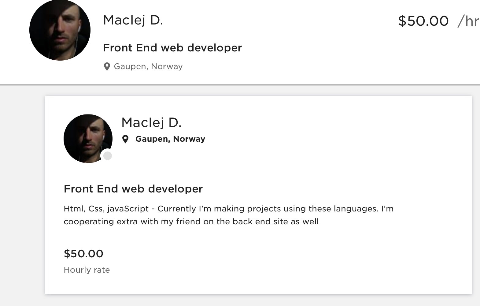 The crazy thing is when searching for more of my articles on Google and googling my name I found an Upwork web developer who sort or resembles me and has a very similar name; it is spelt with an l and not I though: Maclej vs. Maciej. I do wonder if my name and experience covering this topic relates to him choosing it or if it is an actual person sharing my exact name who lives in Norway? Here is his Upwork profile: