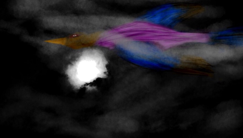 Here is a flying bird I converted into Illustrator, which I originally drew on an iPad using an app called ArtStudio and a third-party stylus. Then, I changed the background cloud image a bit using the Bloat tool. I also added some filters to it and made a brow and eye using vectors: