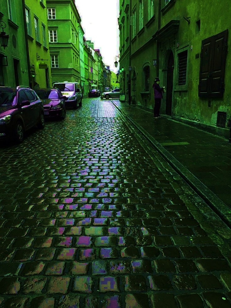 Below is an image of old town Warsaw (enhanced slightly from the original version) where I used to live and a version with a different hue or color and saturation below it I created. Finally I combined aspects of both into a third image below them as you see below: