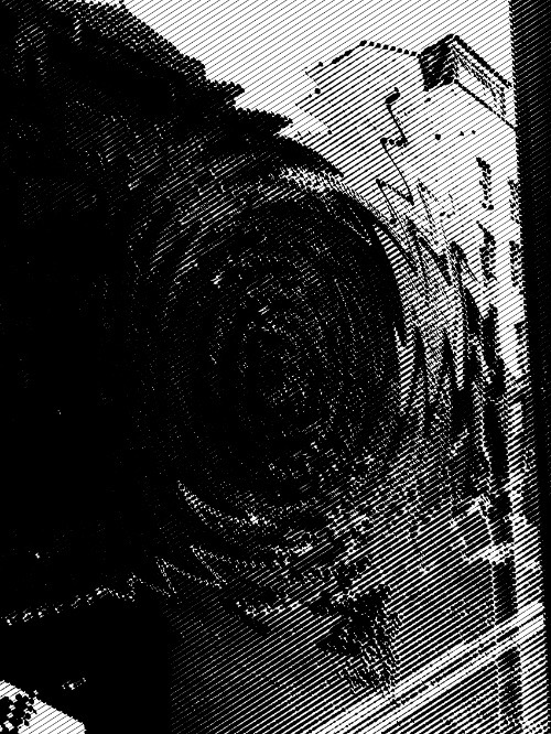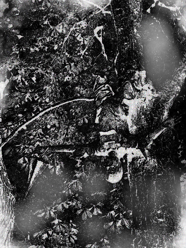 I sort of like this version less defined of the face I also created with some experimentation, or left side of the face, because of how dithered it looks, as if the mural, or rock it is made out of, is old and falling off it: