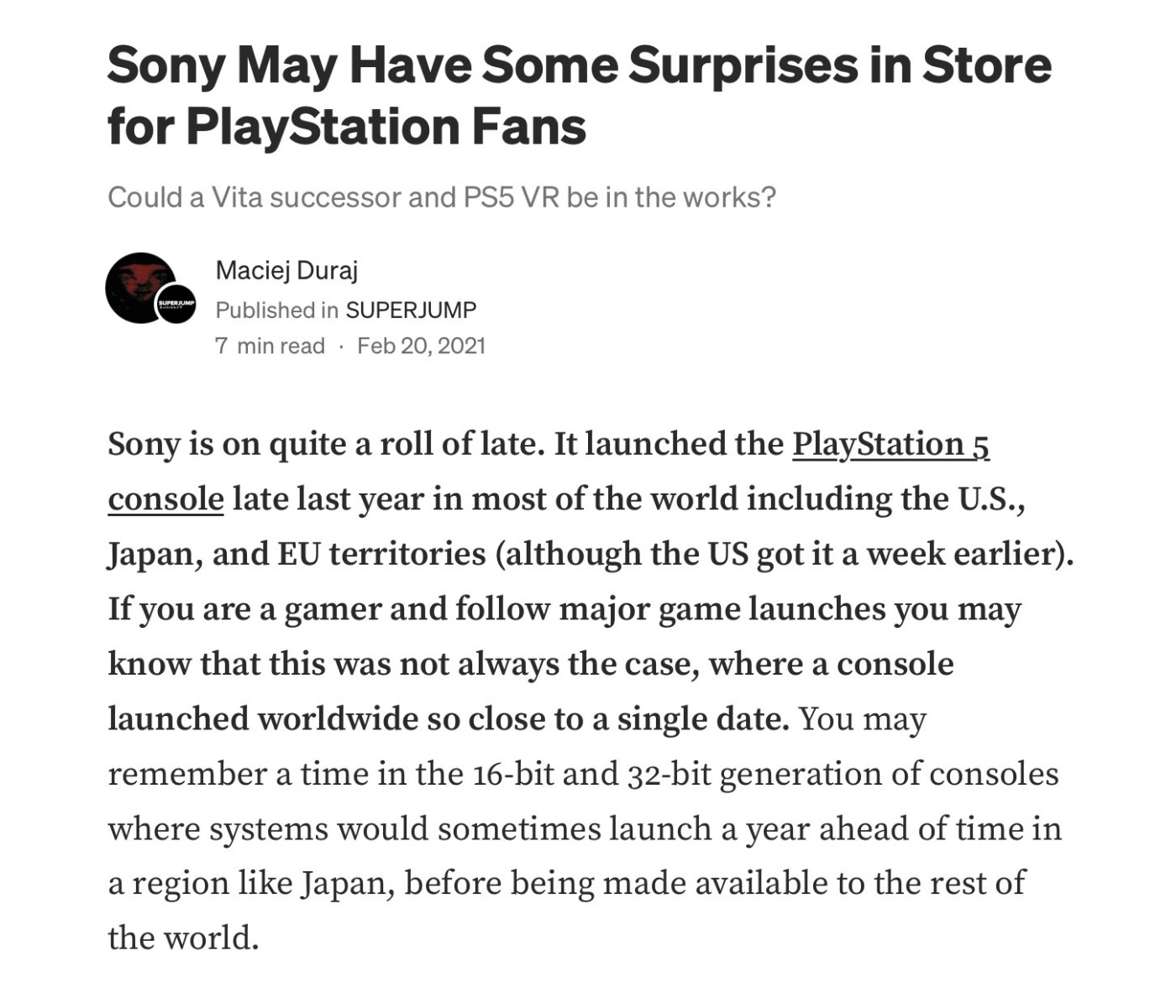 The article I wrote is titled ”Sony May Have Some Surprised in Store for Playstation Fans.” It was based on an interview I just happened to accidentally run into and watch on Facebook hosted by a company or panel called Netguru between Tonino Greco a Sony executive and the interviewee, who happens to be a Polish guy at Netguru and seems to do all the interviews Netguru hosts. You can view the SUPERJUMP article I wrote here. It was 200 claps as well, as of this writing, which is quite a feet for me on Medium: