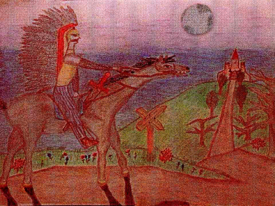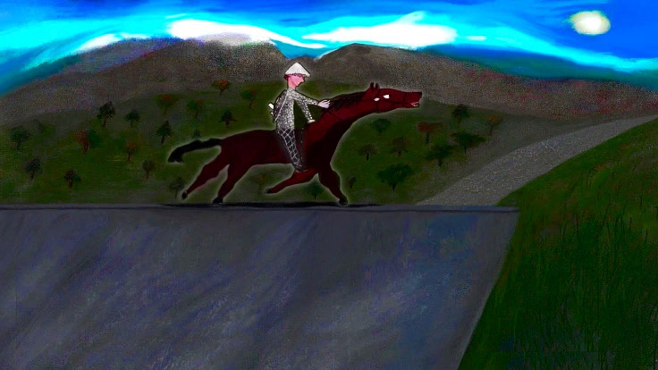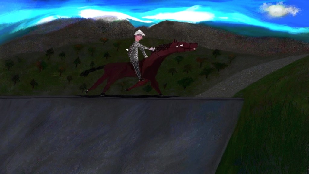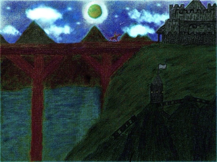 A Hussar riding to a castle or structure of sorts. I originally drew the original using soft pastels and fixed the rider’s leg being too short and abstract looking digitally from that original version. I also like superimposed the moon sort of cut and paste it to make it look almost like it is coming out of the image or put on top of it.