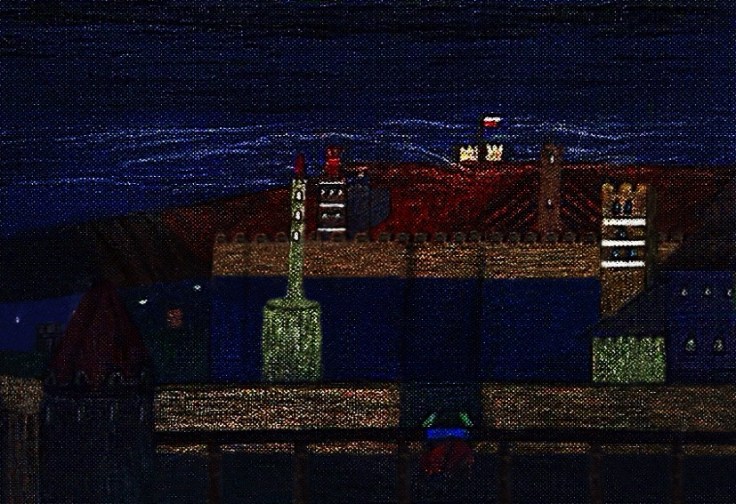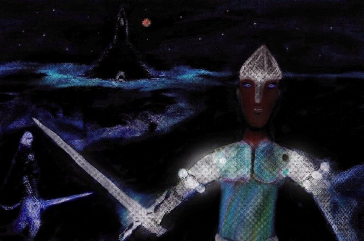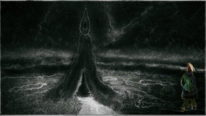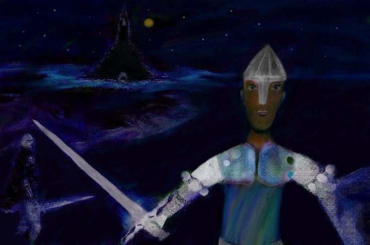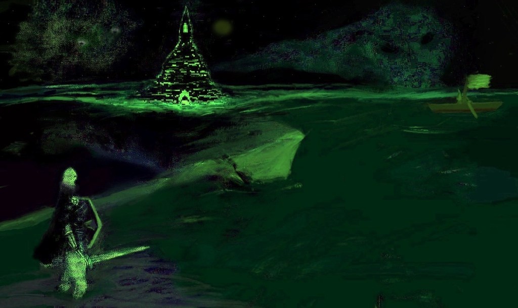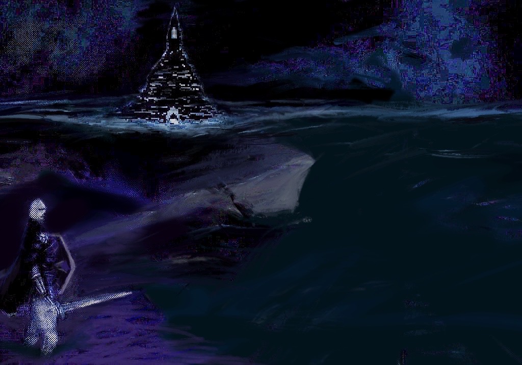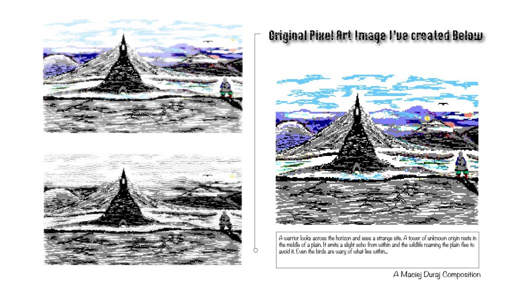 A warrior overlooks a tower of sorts in the two works below. I used different colors including monochrome in different versions of this as well as pure pixel art in some versions. In a way it combines pixel art with standard digital art for a surreal look. Keep in mind that the idea of it happens a lot in games, for instance the image within this article shows somewhat of a similar idea done in pixel art just like I did the first image below.