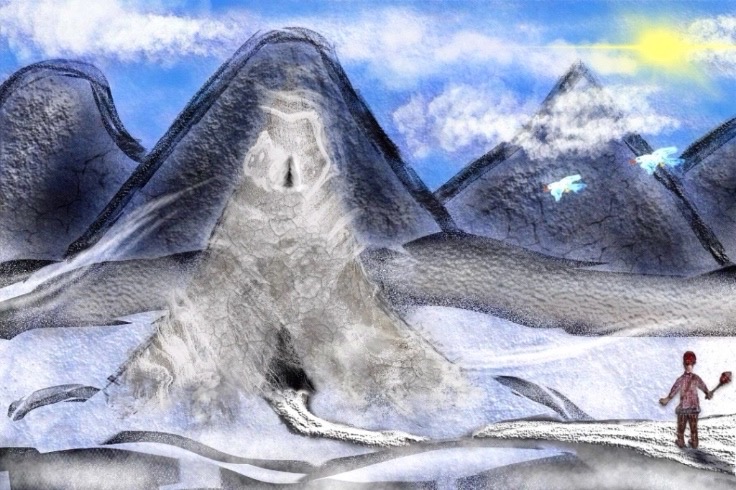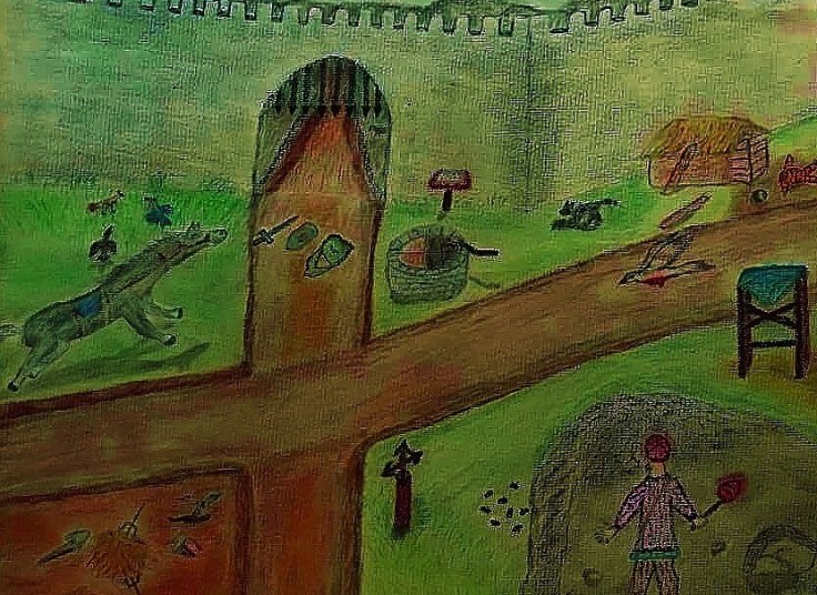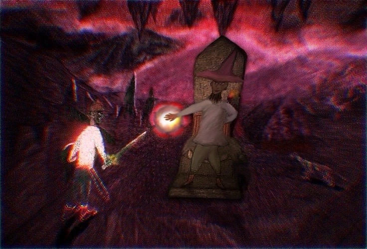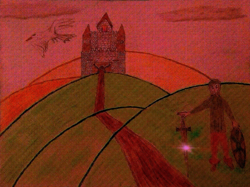 Below is a soldier or warrior facing a dragon and lizard-like and hybrid creature of sorts. The hue is reddish due to it being around some volcano area as well as the creature breathing fire. It also started out as a hand-made drawing that I digitized.