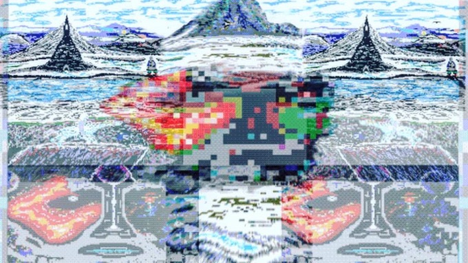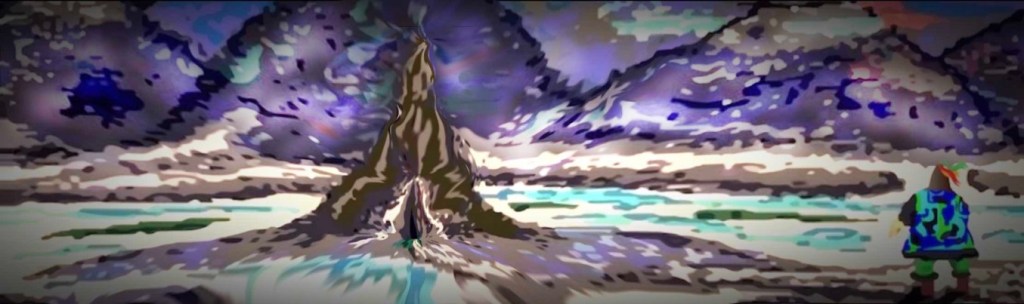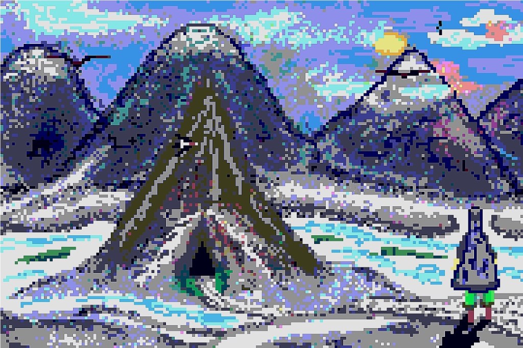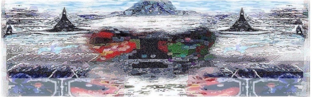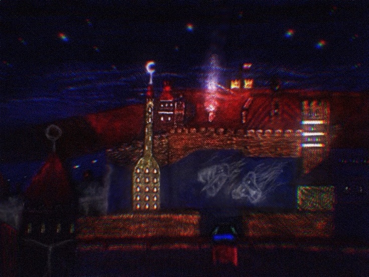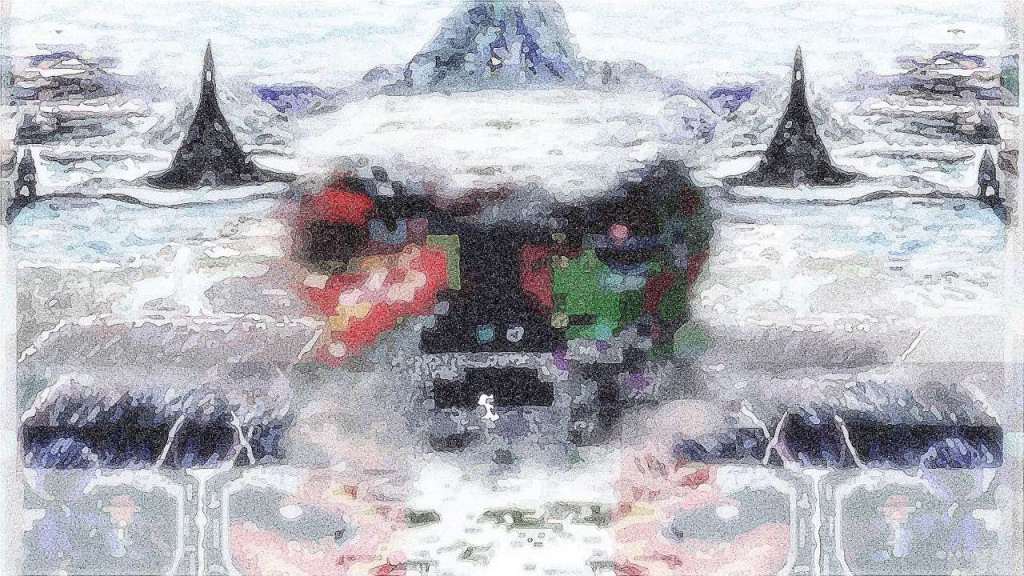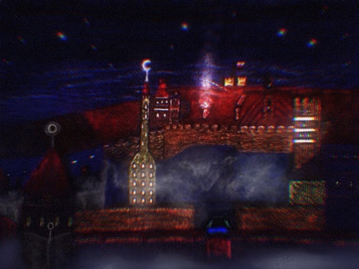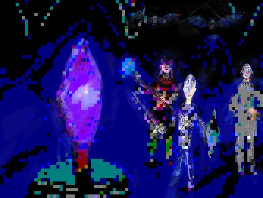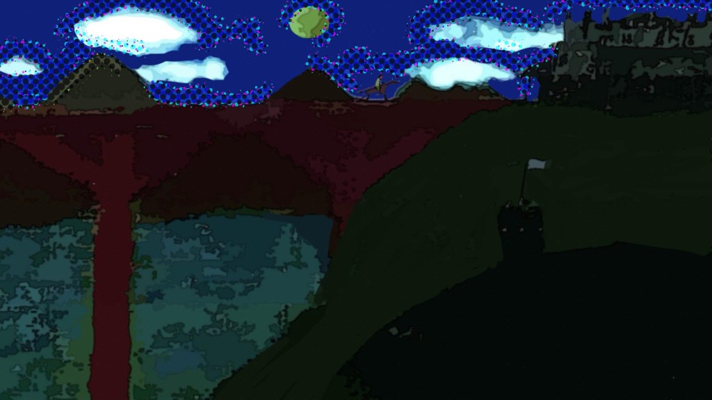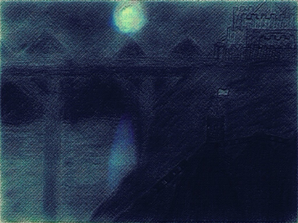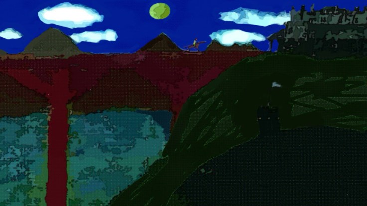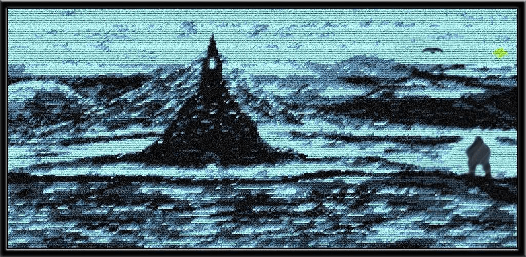 This one started out as one of the variants above (first one if I recall above) and also was in pixel art before adding to it various techniques, filters and colors. However it resembles almost a map of a landscape from farther down or from a greater bird’s eye view. I’d you look closely you may see things appear within it like a castle on upper left: