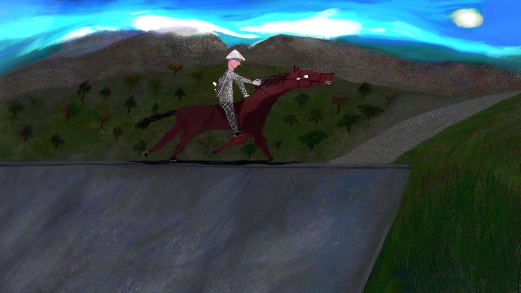 This is an older illustration I created based off the idea above or a horse rider but this one was completely created digitally without using photos of any of the original hand-drawn versions – just the idea of a horse rider being here. Notice that I fixed the slope of the rock formation the horse and rider is riding on from previous versions, if you have seen them:
