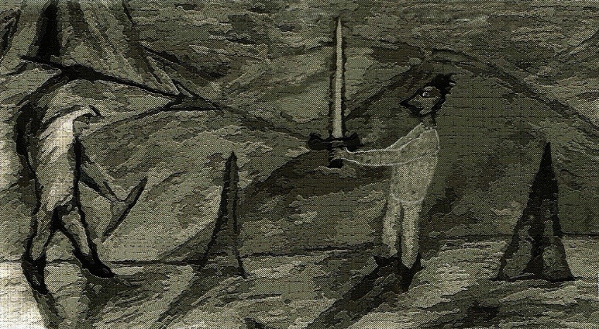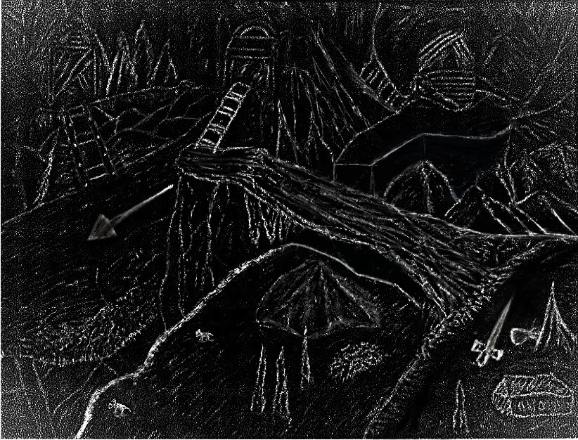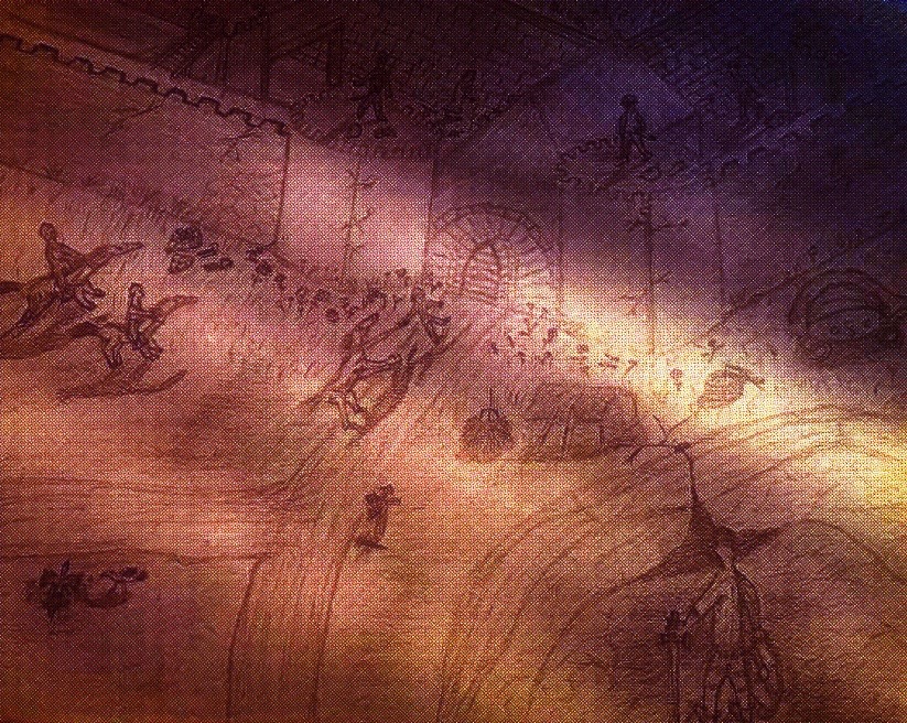 This is a Dungeons & Dragons-like setting I created originally using only a white soft pastel on black paper and digitized.