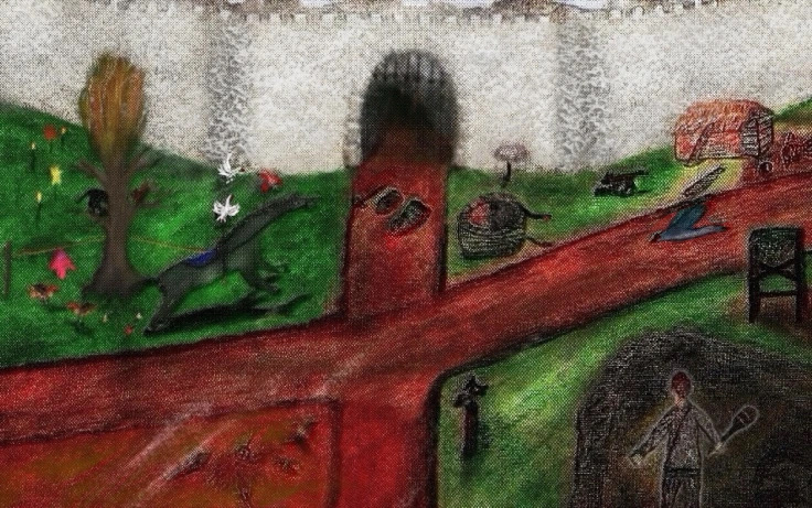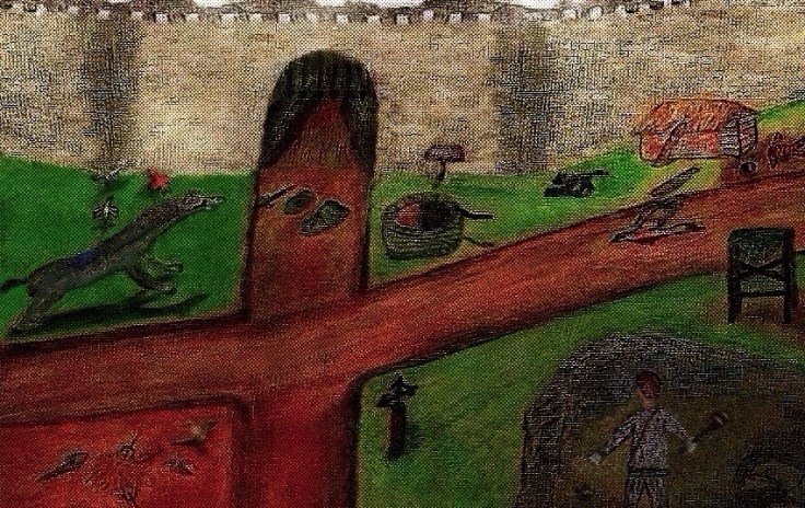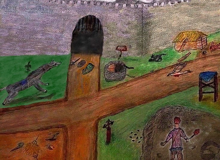Mix oil pastels with soft pastels below with some charcoal. Maybe the angle of the castle or city outskirts wall was too much in the hand-drawn original I did, so I change dit digitally for the second and bottom version among some other things: