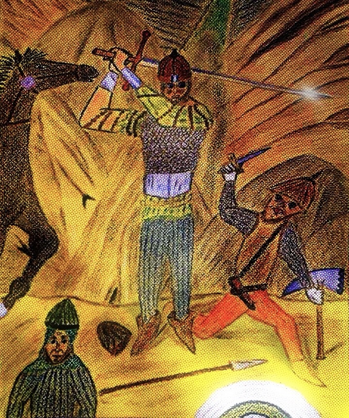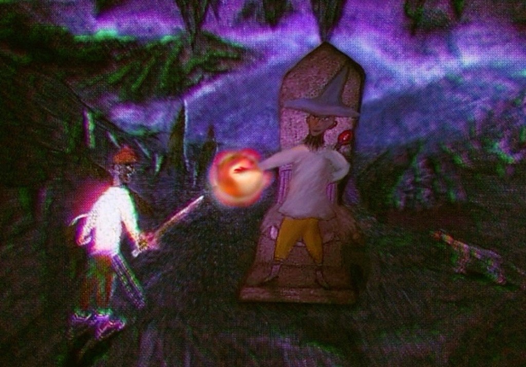 Below is a warrior facing a wizard that started out as a pastel drawing. I have some older and varied versions of it that change the wizard’s beard and face slightly as well as the small cat or dog creature next to him – among other latest additions later added.