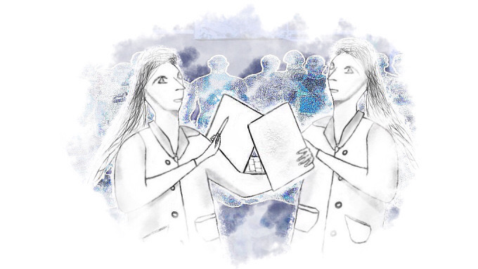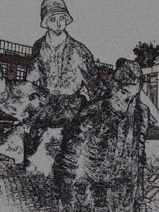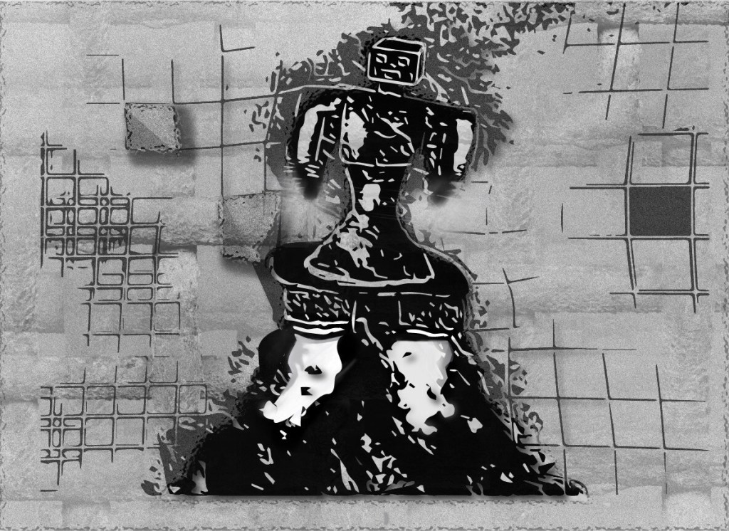 Taking the concept further of combining digital illustration with photography. I’ve added photography I’ve taken in Barcelona (the columns on sides of doorway as well as the to ghostly figures that were statues from National Museum in Warsaw I edited and added with low opacity. The rest is from my own assets or digital graphics I’ve created and am reusing, albeit revising, for this piece: