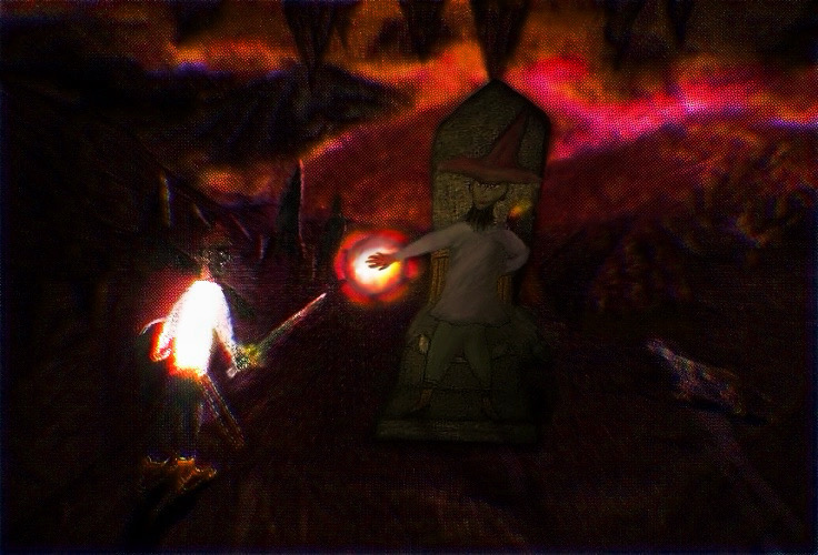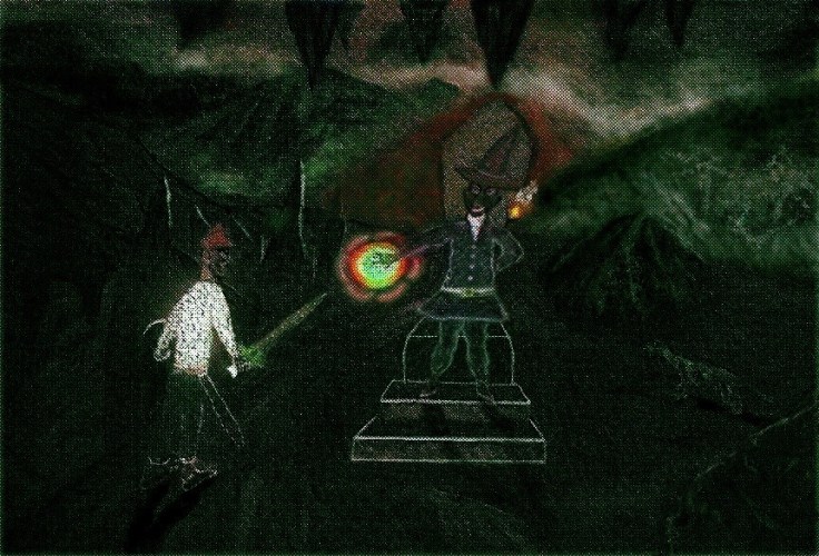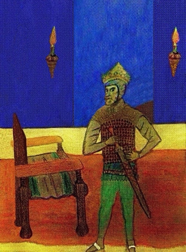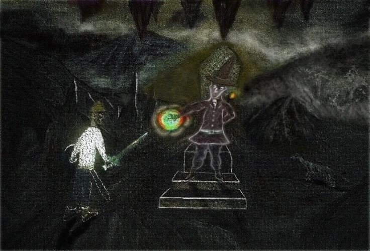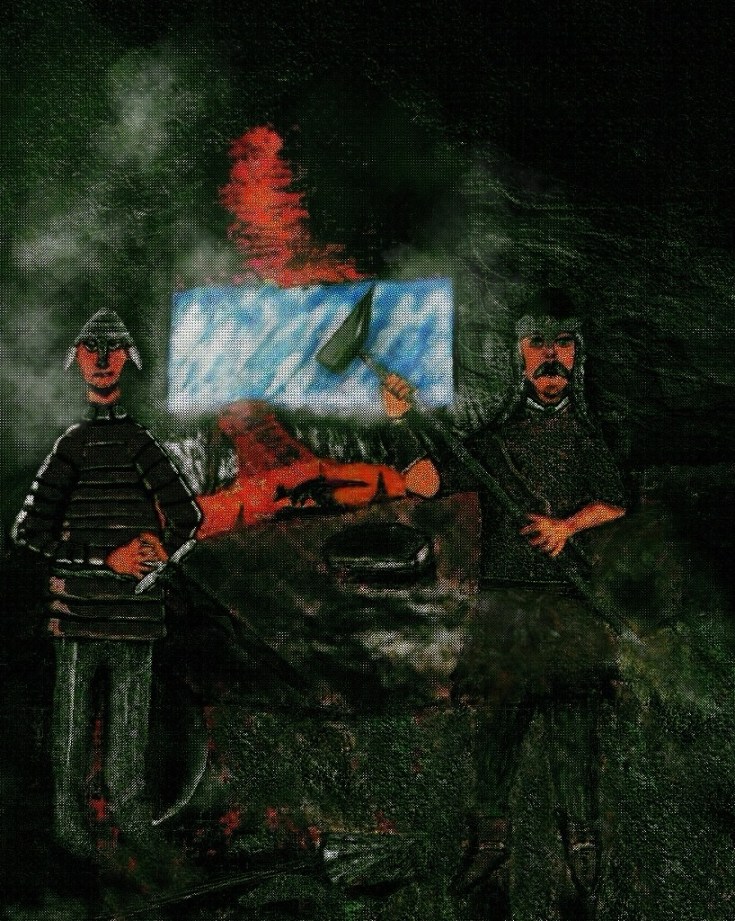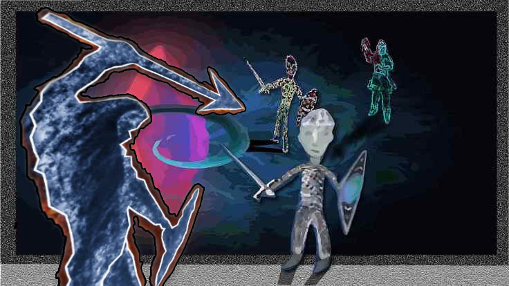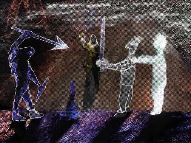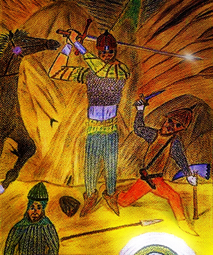 This one was done originally by me in pure oil pastels but I digitized it by taking a photo and adding to it such as the sun ray bouncing off the sword using digital media or brushes and some shadow effects as well as highlights: