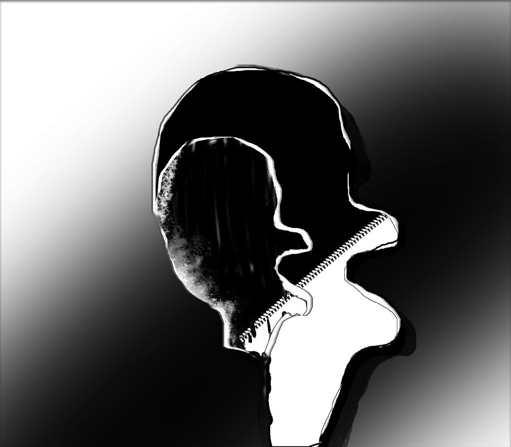 This one started as a photo that I digitally manipulated into a puzzle piece of sorts and also the theory of duality or yin yang and two sides of one coin comes into play in this work: