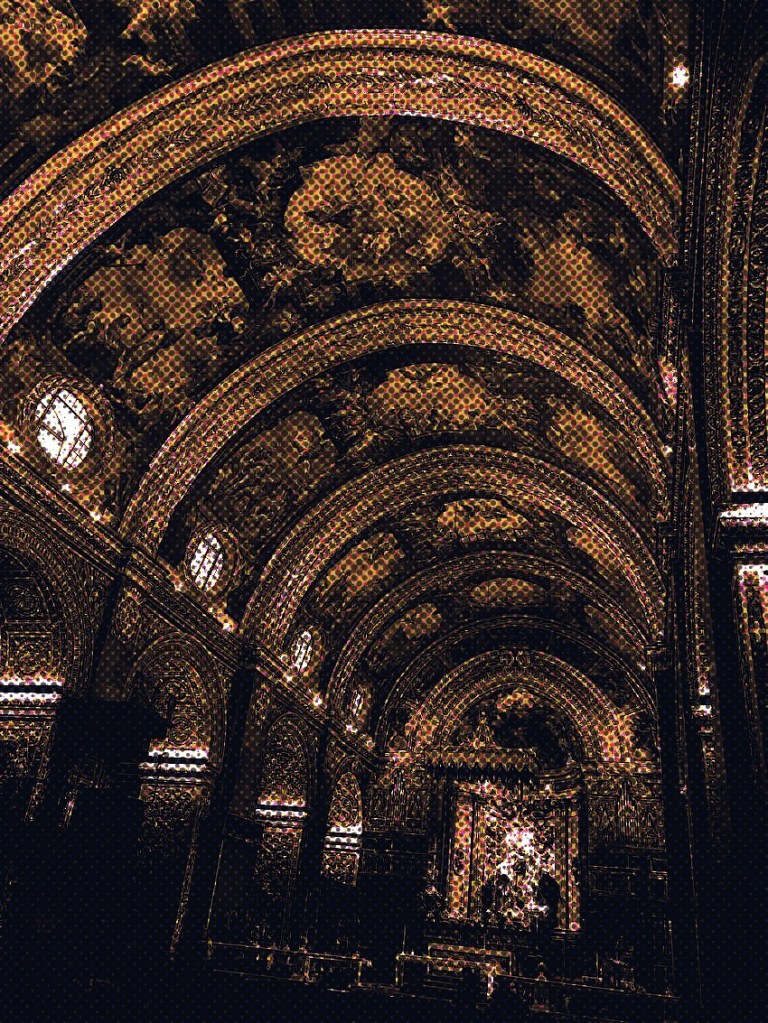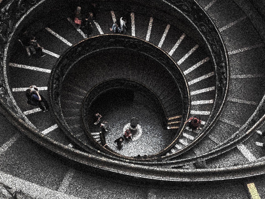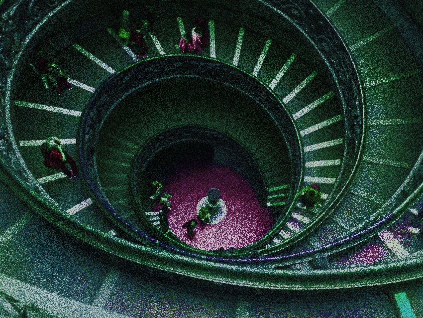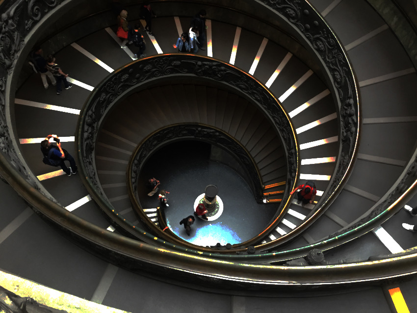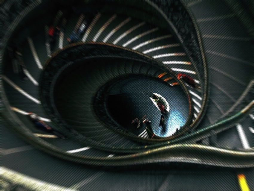 My distortion and manipulation of famous staircase in Vatican, called Scala Elicoidale Momo. I also took the photo before manipulating it myself looking downward (note, more versions below):